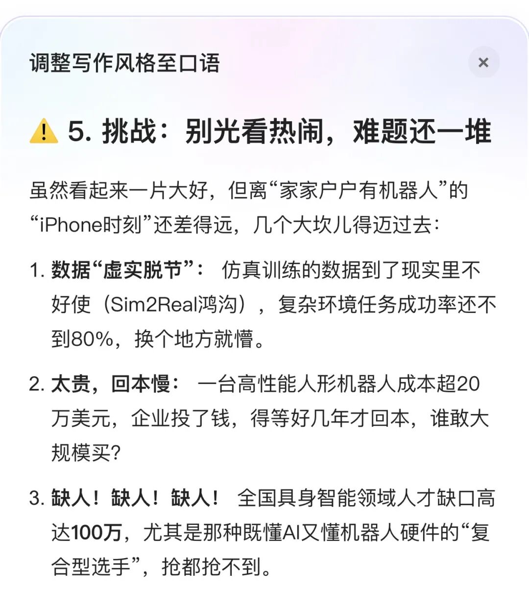 这回我把一段偏严肃的行业报告改成更口语的表达,用的是「调整语气」里的“口语”风格,确实更像科技自媒体的调性了:
