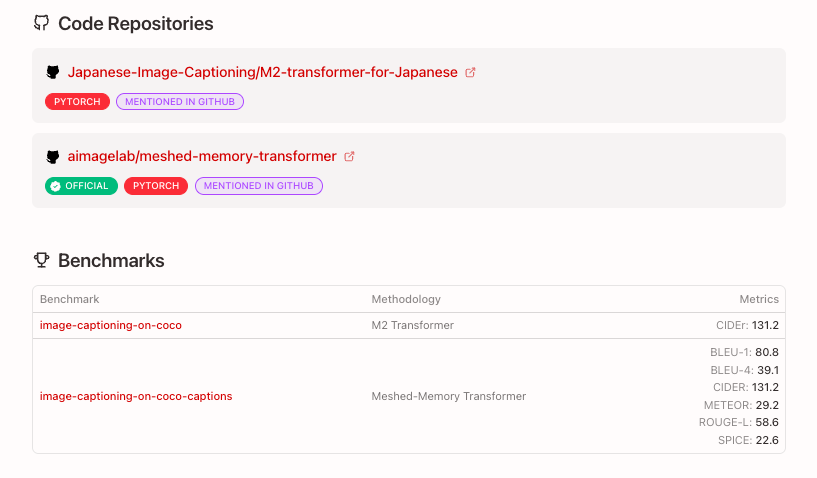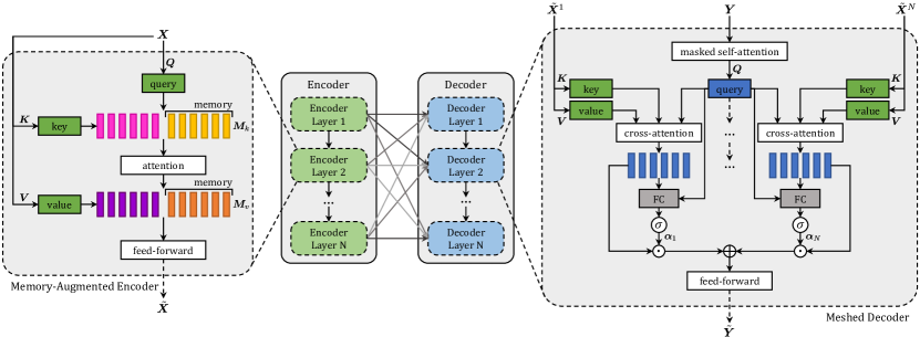 本文提出 M²——一种面向图像字幕生成的带记忆网格 Transformer(Meshed Transformer with Memory)。该架构在图像编码与语言生成两个阶段均实现改进:一方面,通过融合学习到的先验知识,构建图像区域间多层次关系表示;另一方面,在解码阶段采用类网格的连接结构,有效利用低层与高层特征。