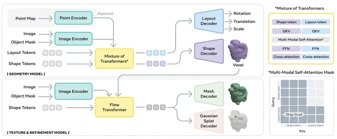 本文提出 SAM 3D,一种用于视觉引导的三维物体重建的生成模型,能够仅从单张图像中预测物体的几何结构、纹理信息及场景布局。该模型在自然图像场景中表现尤为出色,这类场景中遮挡和场景杂乱现象普遍,上下文提供的视觉识别线索起着更为关键的作用。