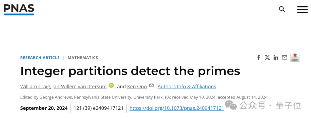 2024年9月,他还在PNAS(美国国家科学院院刊)上合作发表了一篇关于罗杰斯-拉马努金恒等式的应用论文,并将其用于检测质数。
