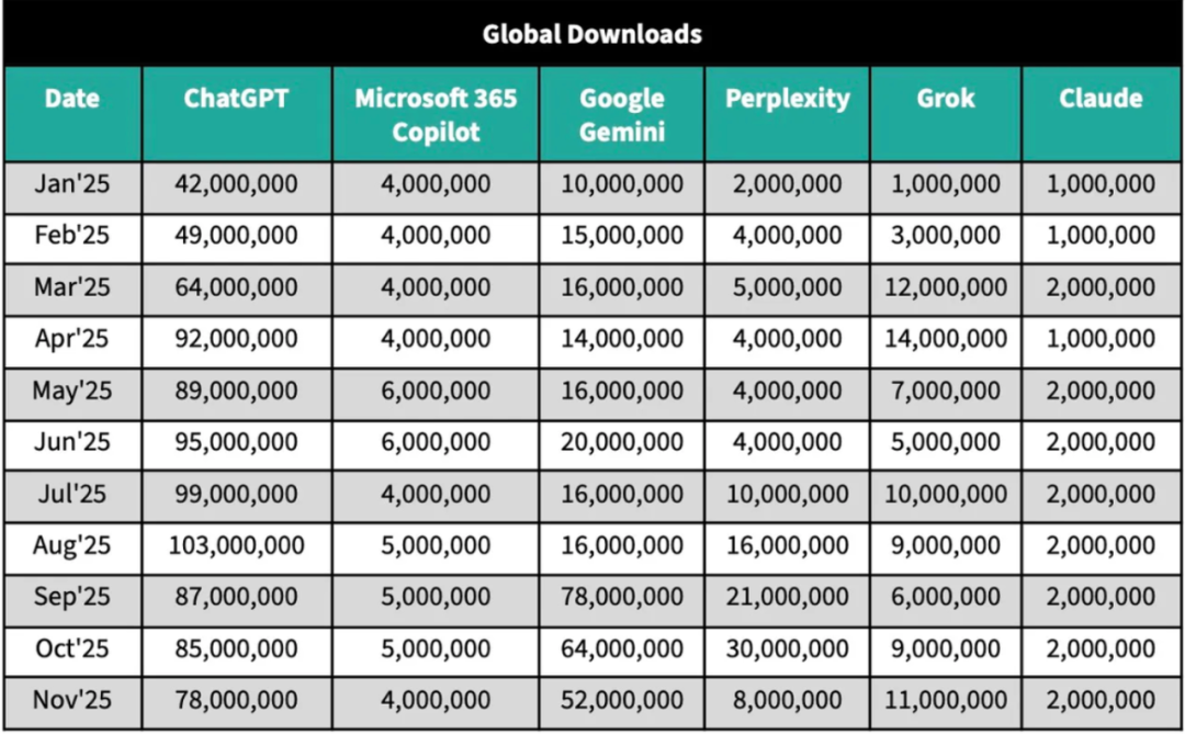 其中,Perplexity与Gemini的下载量增速最高,分别达到215%和190%的同比增长。