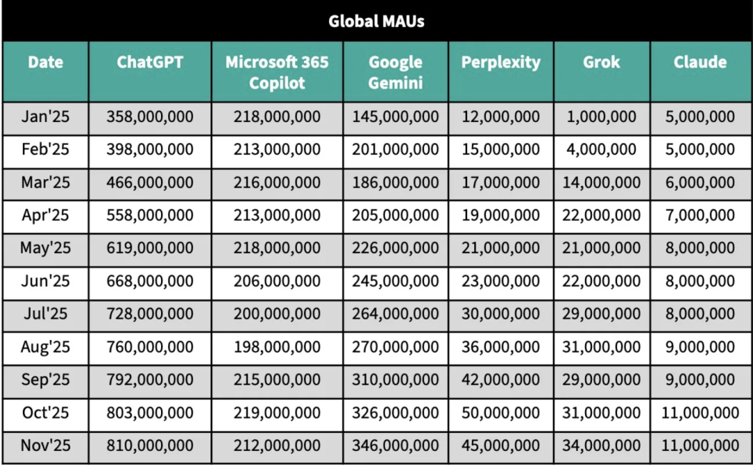 截至2025年11月,ChatGPT的全球月活同比增长180%,而Gemini同比增长170%。