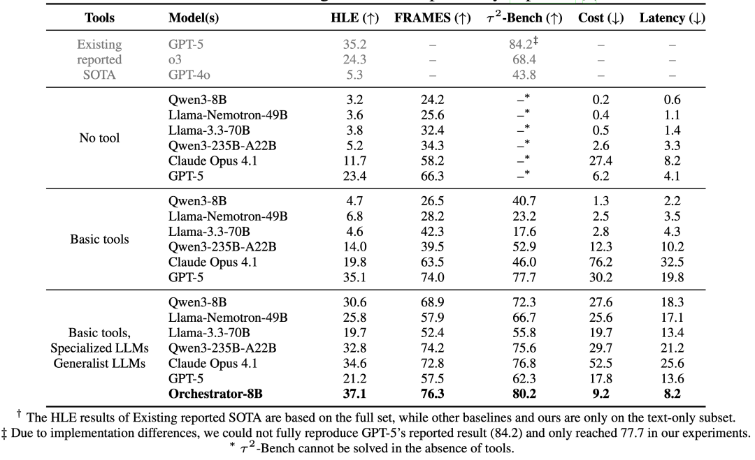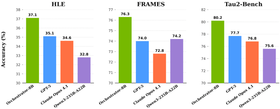 HLE(人类最后一场考试):Orchestrator-8B 37.1% > GPT-5(35.1%)。 FRAMES(事实推理):Orchestrator-8B 76.3 > GPT-5(74.0)。 τ²-Bench(复杂工具调用):80.2 > GPT-5(77.7)。