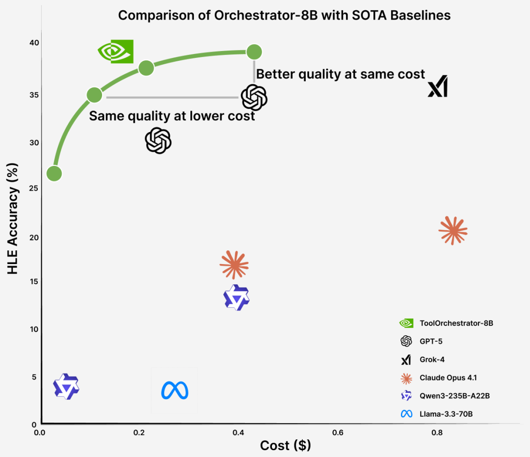 在同等预算下,Orchestrator-8B的准确率曲线始终在GPT-5、Claude 等曲线之上;相当准确率下花得更少。