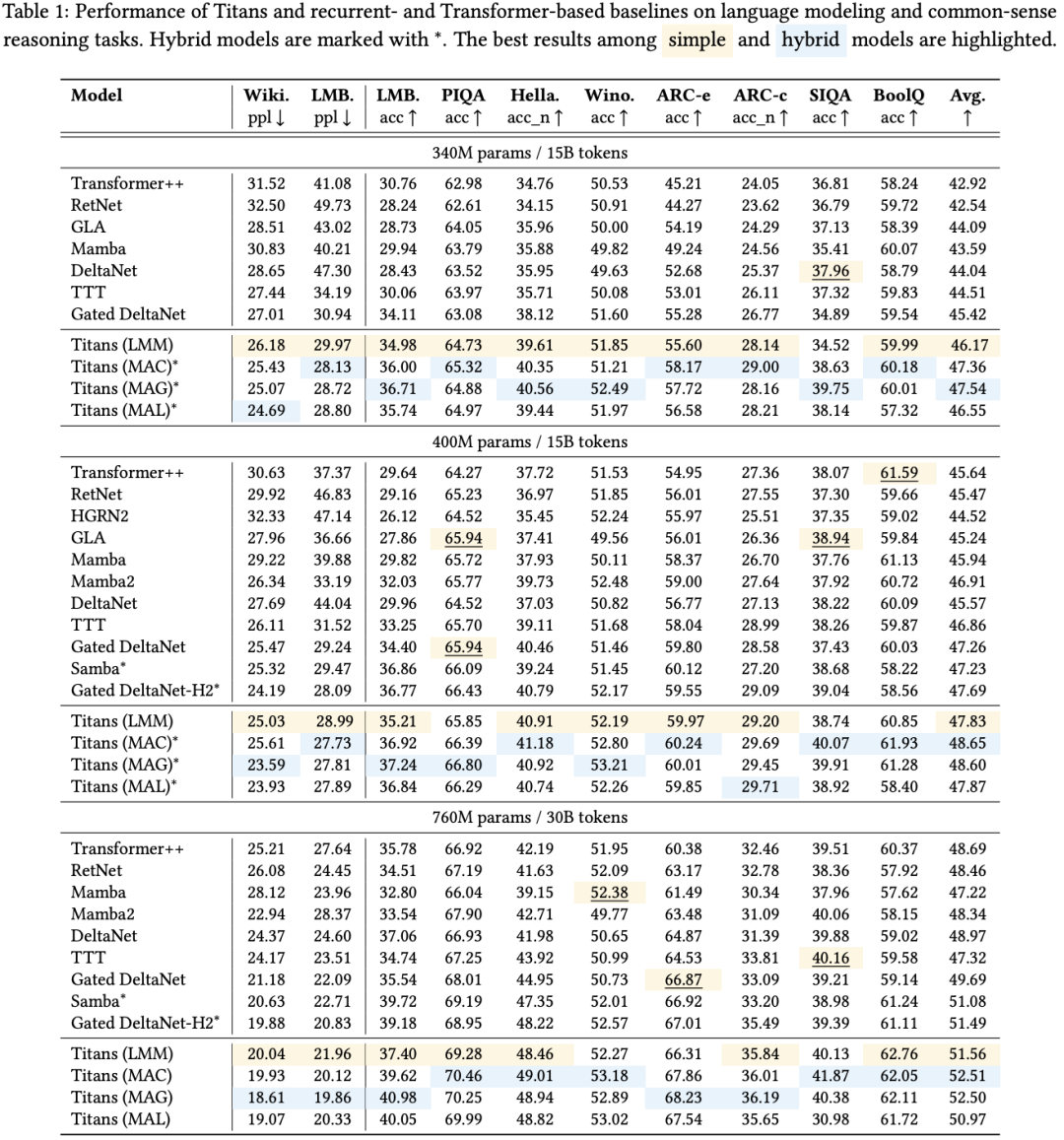 在语言建模和常识推理任务中,Titans架构在同等规模下,优于最先进的线性循环模型(如Mamba-2和Gated DeltaNet)以及Transformer++基线模型。