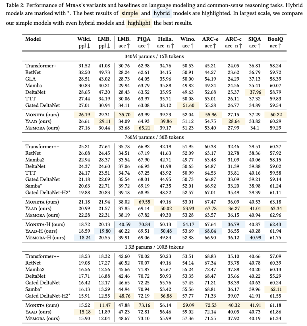 新颖的MIRAS变体(MONETA、YAAD、MEMORA)相比这些基线模型也提升了性能,验证了探索稳健的非MSE优化机制的优势。