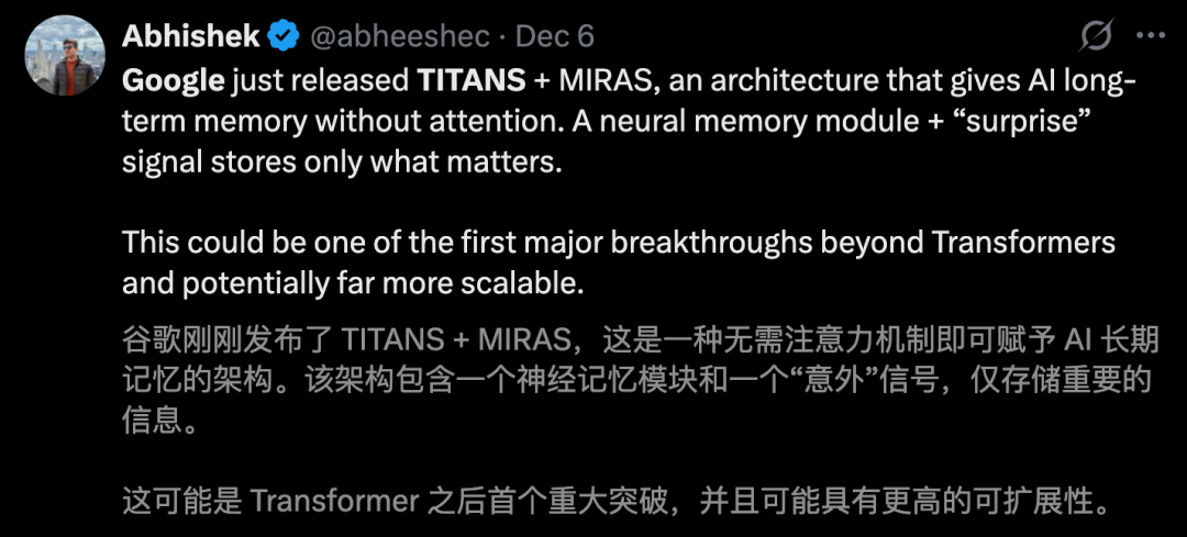 几乎同一时间,谷歌放出了全新的架构Titans,成为Transformer的最强继任者!