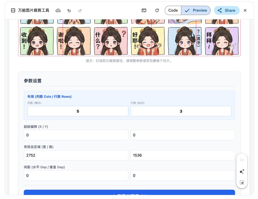 但是如果你先用Canvas做一个截图小工具,甚至还可以选择几行几列的截图,最后还能打包好后下载为zip压缩包。