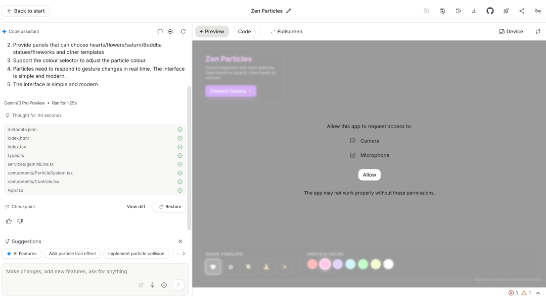 谷歌对Canvas模式下的模型进行了微调(Fine-tuning),强化了它生成完整、可运行的前端代码的能力,并自动补全了许多 Web 环境下的依赖库。 - AI Studio的环境更「裸」: