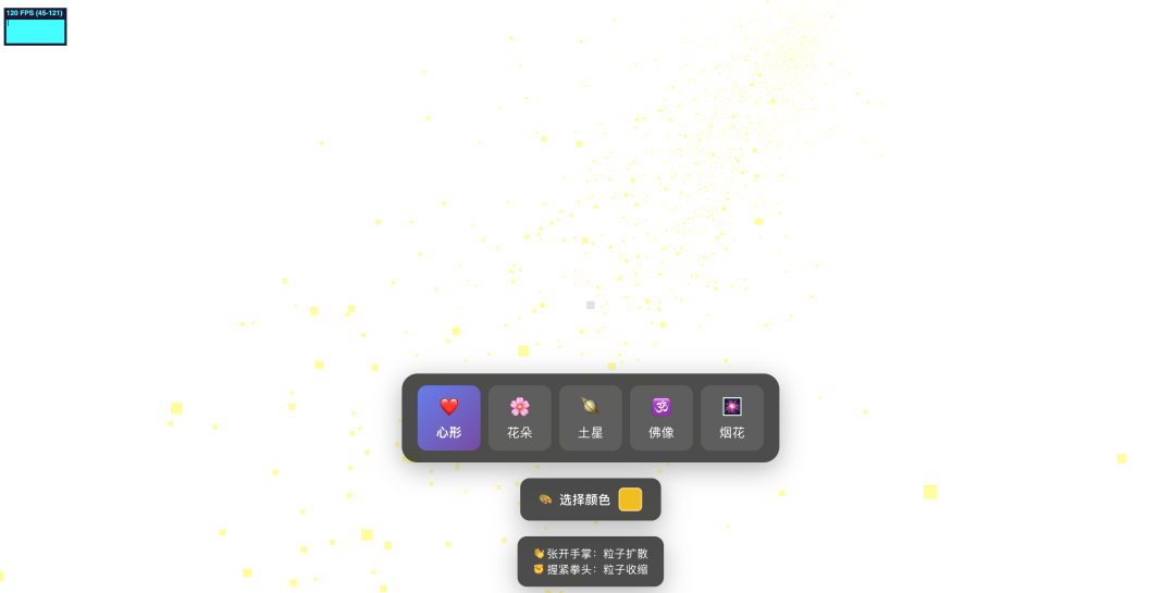 用户可以通过摄像头检测双手张合的手势来直接控制粒子群的缩放和扩散。