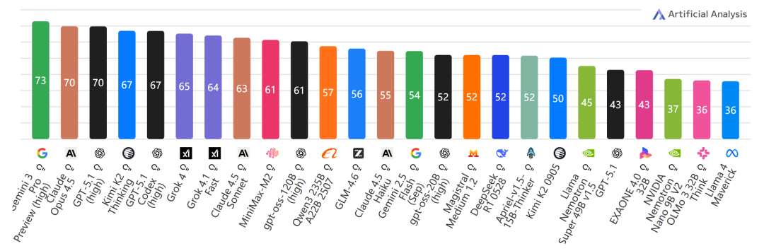 在更强调综合智能的Artificial Analysis Intelligence Index排行榜中,Gemini 3同样以73分位居榜首。