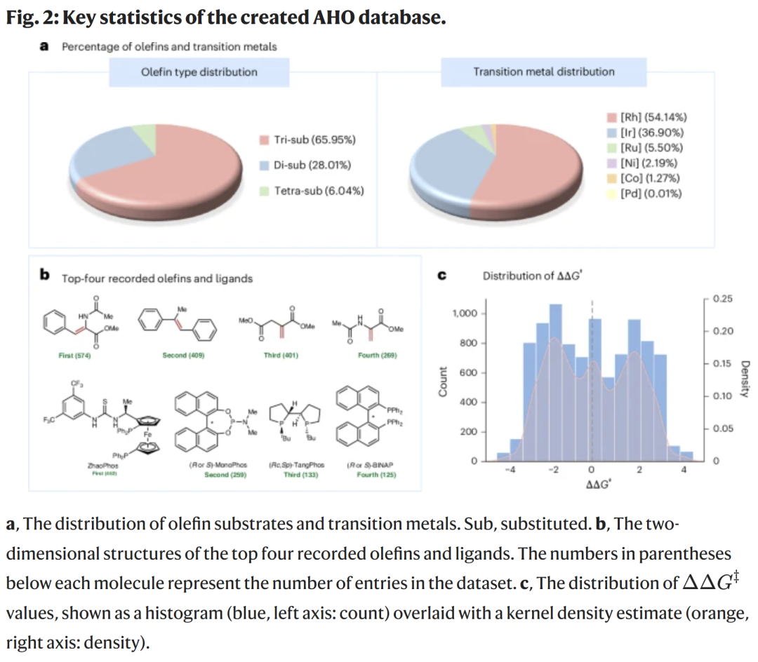 研究人员构建了规模为 9,478 条反应的数据集,覆盖三取代、二取代与四取代烯烃,以及多种过渡金属体系(Rh、Ir、Ru、Ni、Co 等)。