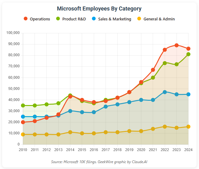2010–2023年微软不同部门员工变化。运营与研发人数暴涨,而行政和市场岗位几乎停滞。组织结构的「哑铃化」趋势愈发明显。