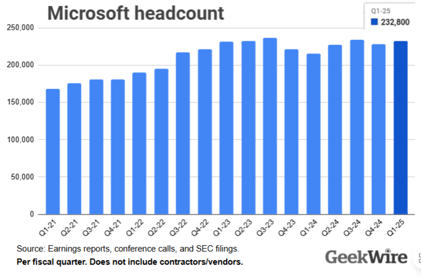 2021–2025财年微软员工总数变化。AI扩张期带来用工高峰,但在2023年后进入重组阶段,员工规模虽未剧减,结构已被彻底重写。