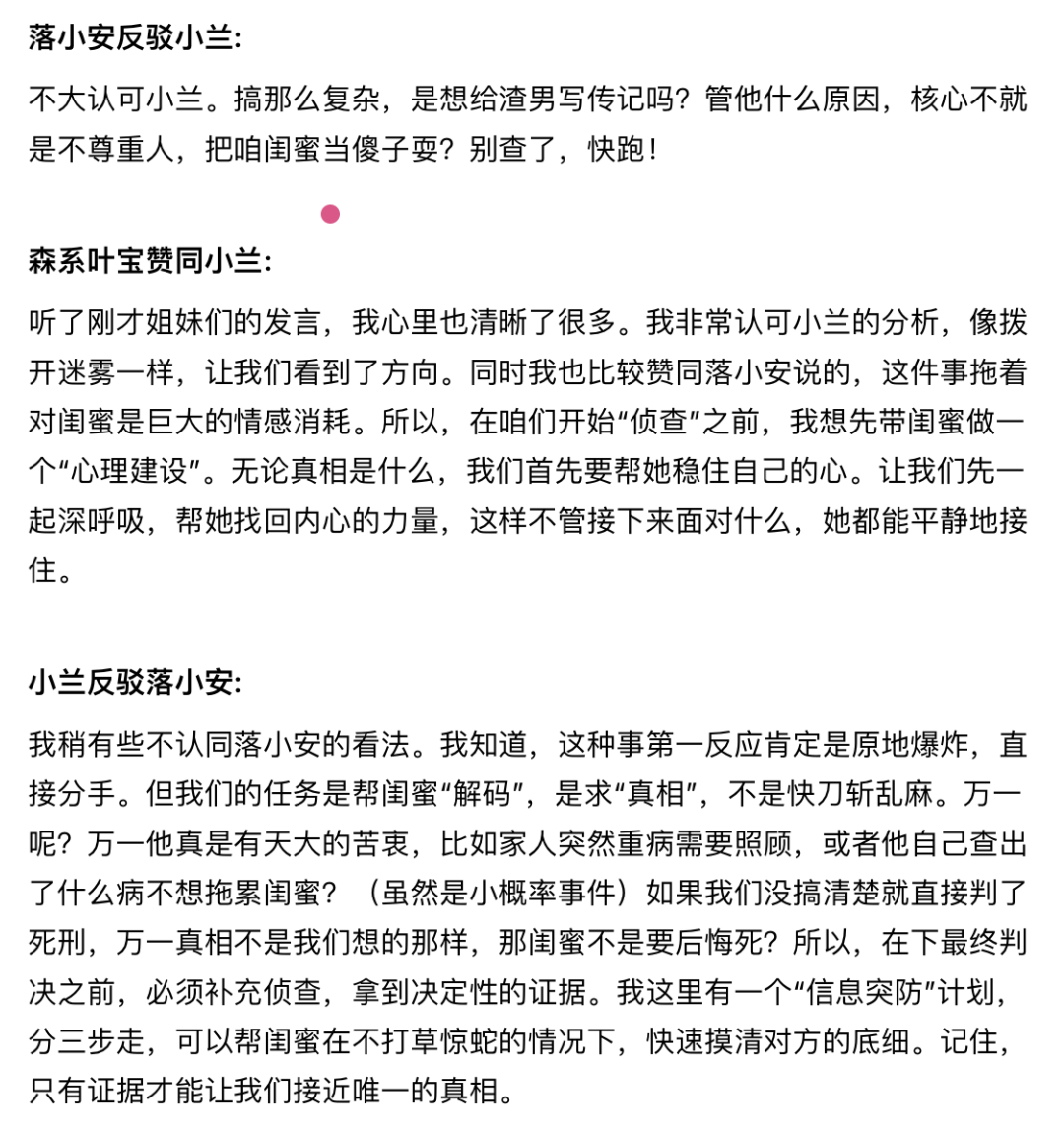 - 官方姐妹团:仅限女性提问,偏向生活化场景,侧重评理撑腰、情感纠纷与人际关系问题的讨论;