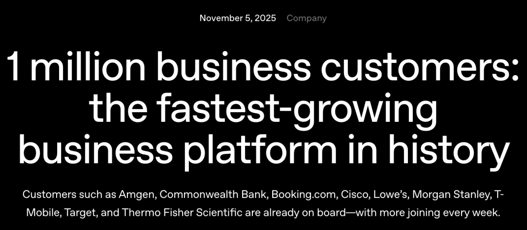 11月5日,OpenAI宣布,全球已有超过100万家企业客户正在直接使用其AI服务,成为史上增长最快的商业平台。