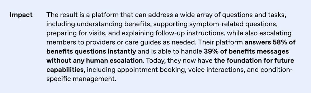 Oscar的AI能够即时回答58%的福利问题,并能在无需人工干预的情况下处理39%的福利相关消息,这得益于AI与医疗记录和理赔数据的深度集成。
