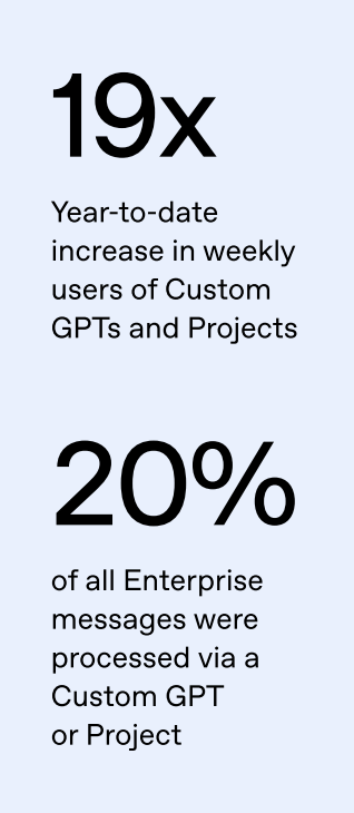 自2024年11月以来,企业周消息量增长约8倍。定制化工具使用率飙升,CustomGPTs和Projects的周用户数增长了19倍,目前约20%的企业消息是通过这些定制工具处理的,显示工作流正被数据化和标准化。