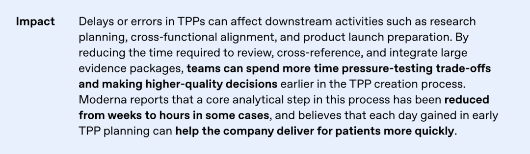 Moderna利用AI处理庞大的证据包(有时长达300页的数据),将目标产品概况(TPP)的起草和分析流程从数周压缩至数小时。