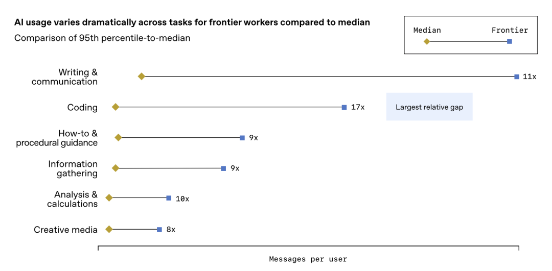 不同任务的差距各异:在编程任务上,头部与中位数的差距最大,达17倍;在分析与计算任务上,差距为10倍。