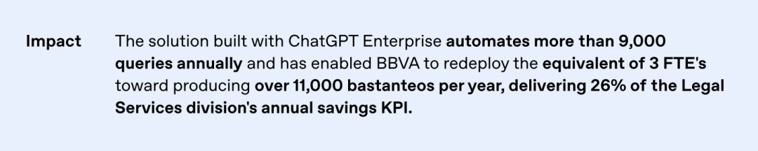 BBVA的法律AI聊天机器人每年自动处理超过9,000个查询,帮助完成了超过11,000个法律验证,贡献了法律服务部门年度储蓄KPI的26%。