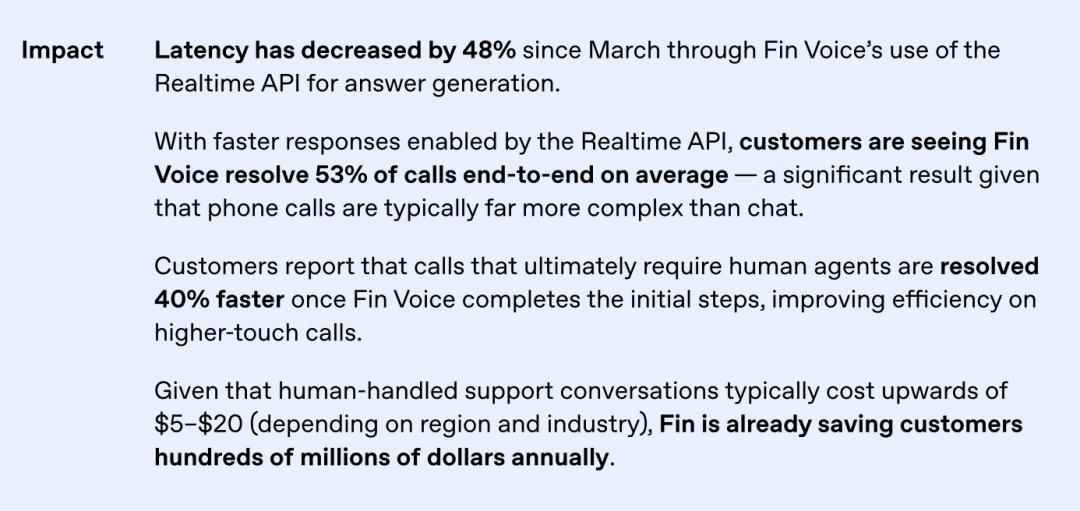 使用Realtime API后,Intercom的语音延迟降低了48%,AI能够端到端解决53%的电话咨询,人工处理后的通话时长缩短了40%。