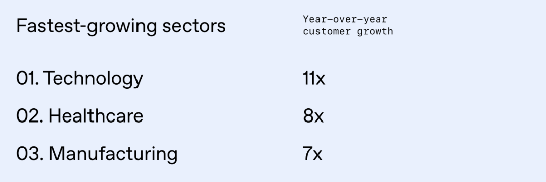 所有行业的采用率都在增长,中位数行业的客户增长超过6倍。