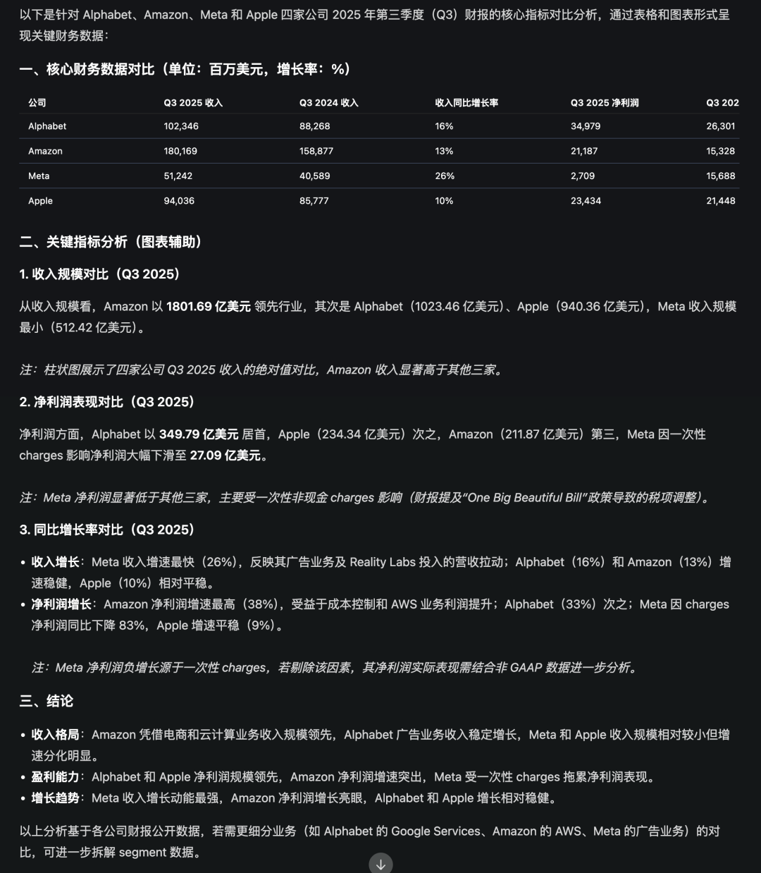 GLM-4.6V的思考过程同样是调取了各个财报中的关键图表和数据,然后先是汇总成了一份对比表格,再对关键指标做了逐一的解析,最终给出了关键性结论。