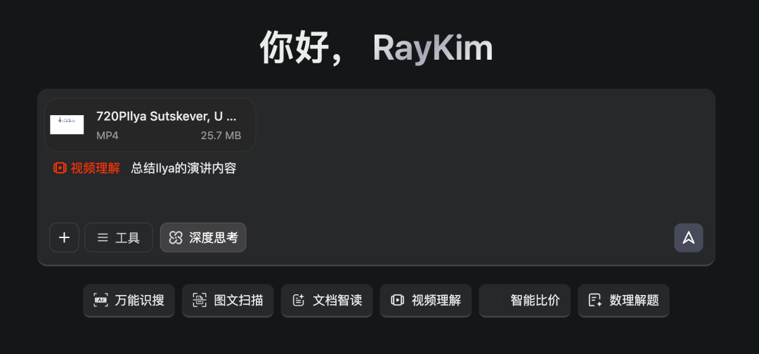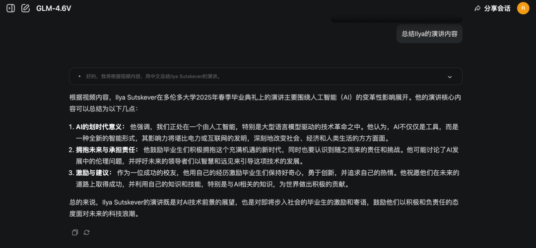 这一次,我们点击输入框下面的“视频理解”功能,然后让GLM-4.6V来对视频内容做总结: