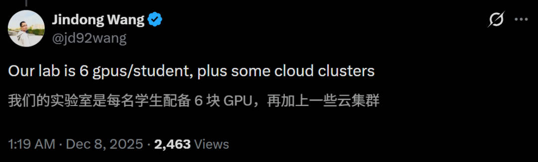 微软研究院前高级研究员,威廉与玛丽学院助理教授Jindong Wang表示,实验里每位学生配备6张GPU,还有云集群可用。