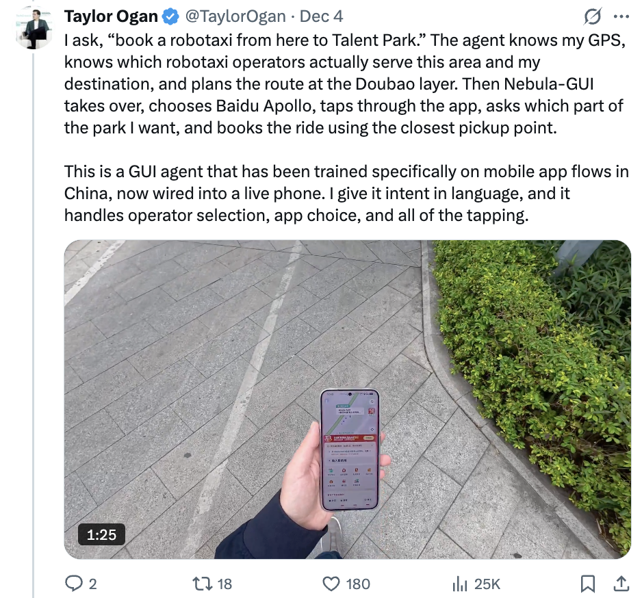 他还展示了告诉豆包手机助手从其当前所在位置打辆无人车去某公园,只见它会获取其GPS位置,知道哪些无人车运营商覆盖其所在区域和目的地,并完成路线规划,接着打开打车软件逐步点击应用界面,询问其具体要去公园的哪个位置,并根据最近的上车点完成叫车。
