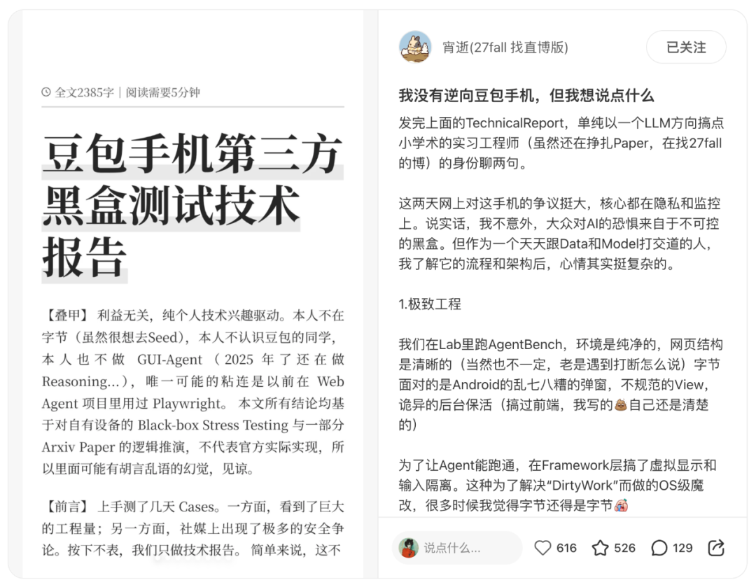 例如小红书博主@宵逝(27fall 找直博版),他在测试完豆包手机助手后,写了一篇长达2385字的分析。