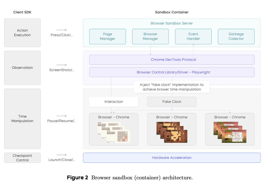 最后,团队还开发了统一的沙盒平台,以标准化API管理云端VM、浏览器游戏沙盒等异构环境,支撑数百万次交互的大规模训练与评估。