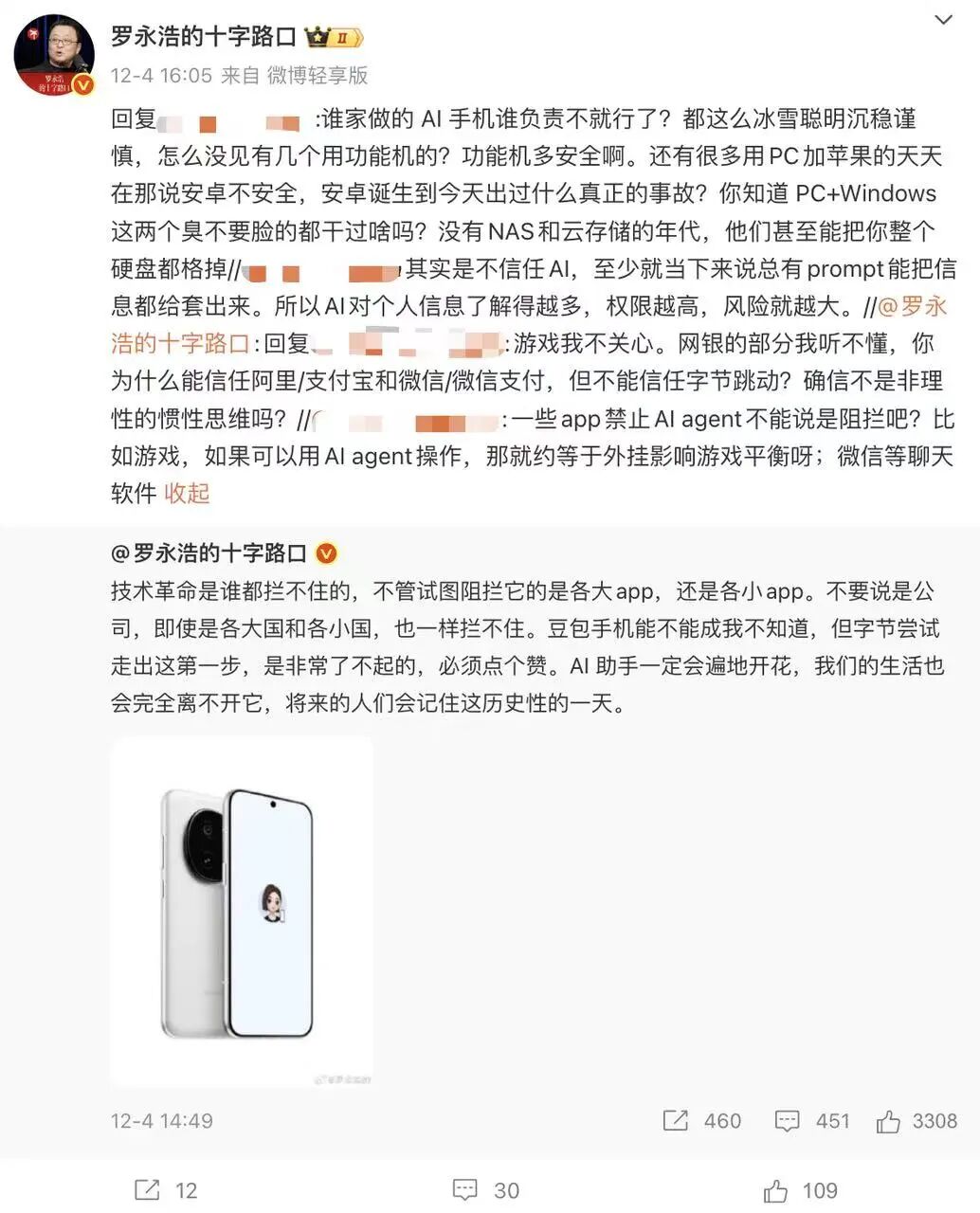 另外,老罗在“豆包手机”发布后,也点赞表示“技术革命是谁都拦不住的”,还和网友在评论区观点交锋了一下(虽然这款手机也被发现了罗永浩“锤子手机”代码)……