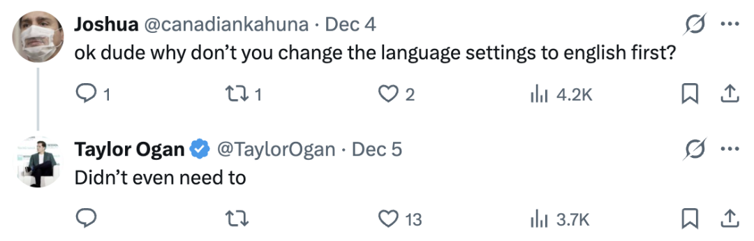 有人看他的手机界面,问他“为啥不先把语言设置改成英语”,Taylor Ogan回应“甚至都不需要”。