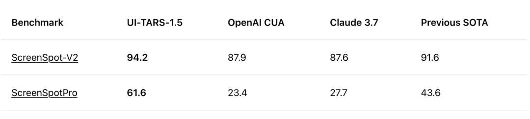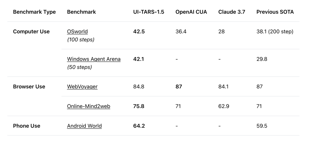 在多项标准基准测试中,UI-TARS-1.5相比前代模型实现了显著进步。