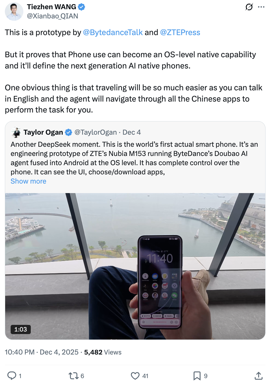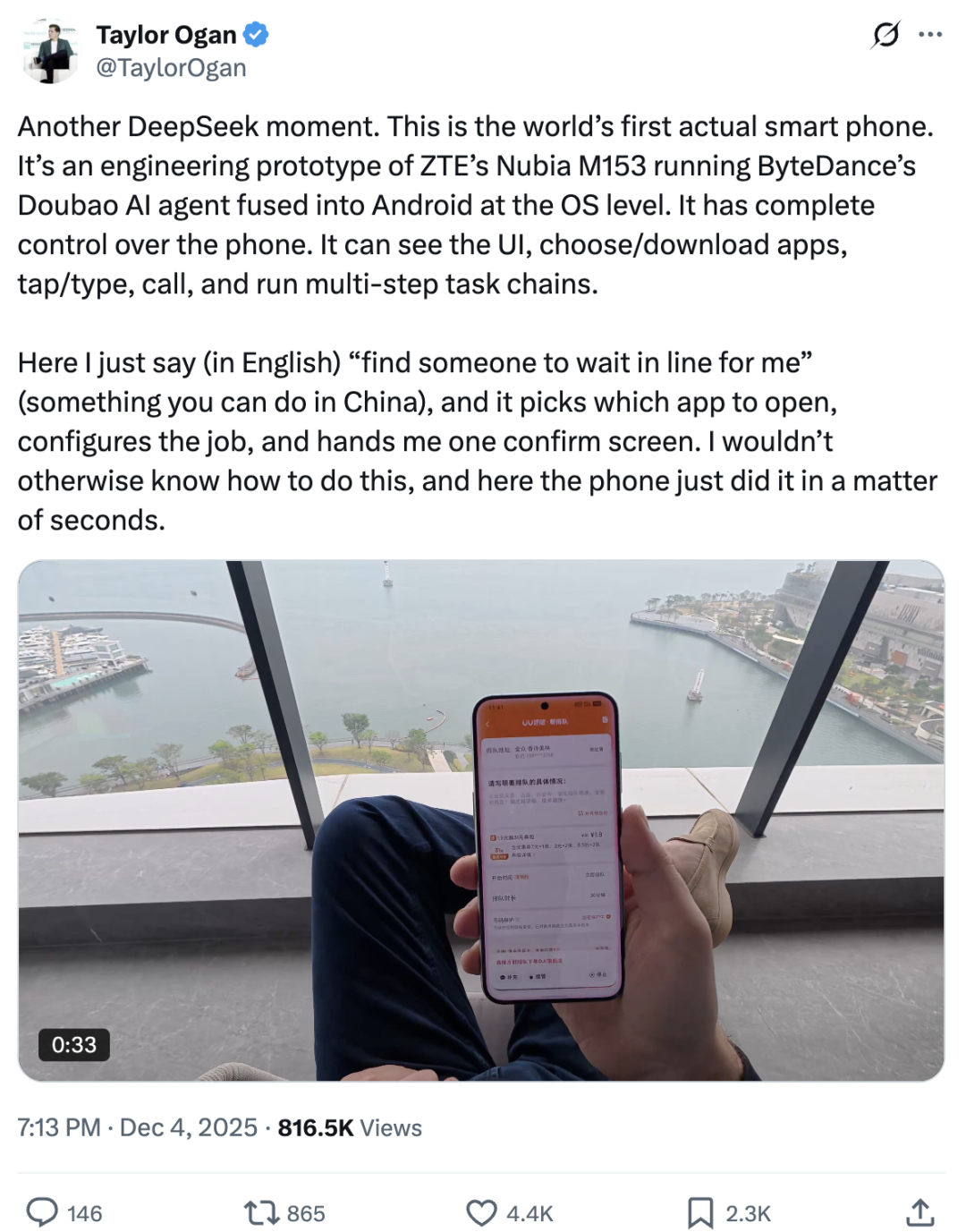 在华创业者Taylor Ogan拿到了手机后,就在𝕏上连发帖子,给出的评价那是相当的高(发出宋丹丹的声音),称其为“又一次DeepSeek时刻,这是全球第一部真正的AI智能手机”。