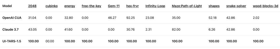 他们从poki.com挑选14款游戏进行测试,通过标准化评分,UI-TARS-1.5在与OpenAI CUA、Claude 3.7的对决中胜出。