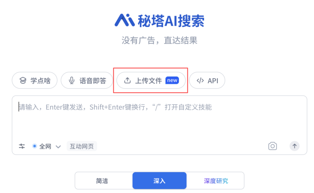 我们回到首页,会看到搜索框中有个上传文件的按钮,只要我们在这里上传,就会自动建立一个新的知识库。
