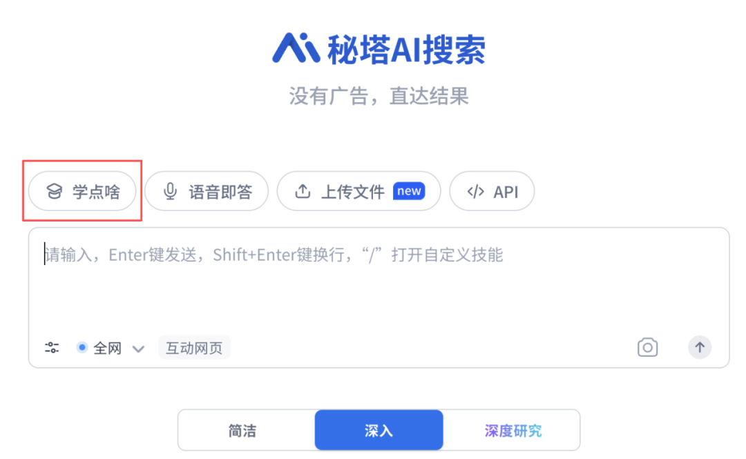 聪明的你也许发现了,在秘塔的搜索框上方,有一个“学点啥”的按钮,这就是PPT和讲解功能最主要的一个入口了。