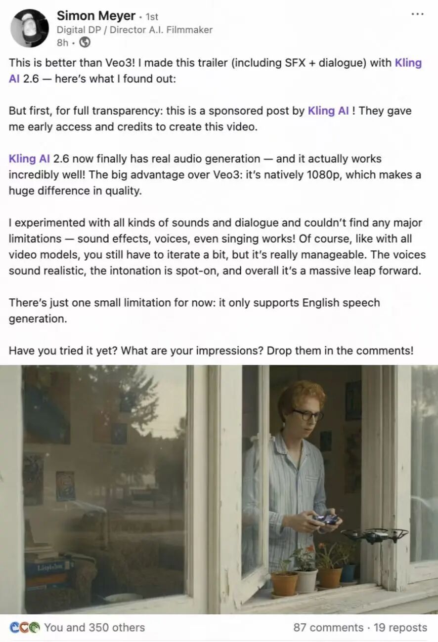 可灵AI海外超级创作者、AI电影导演Simon Meyer制作的这支宣传片,生动诠释了这次可灵2.6的能力创新之处: