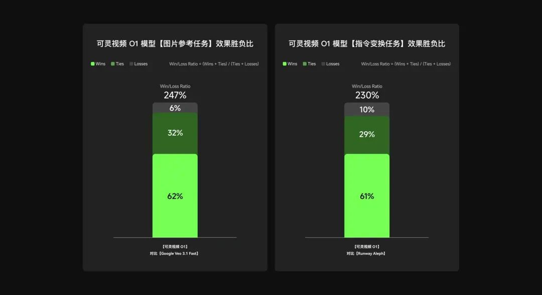 根据可灵AI团队的内部测评,在“图片参考”任务上,可灵AI对Google Veo 3.1的整体效果胜负比为247%;在“指令变换”任务上,与Runway Aleph对比的整体效果胜负比达到230%。