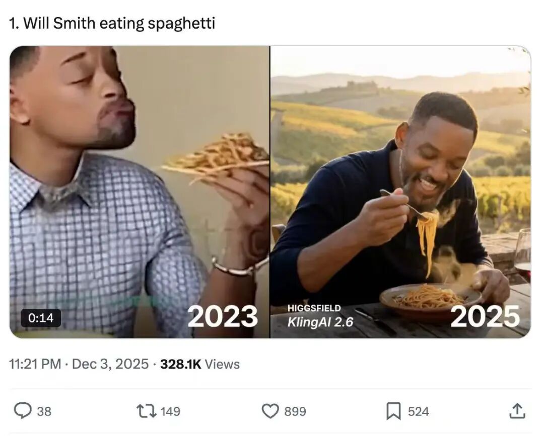 △X网友Min Choi发布的文章,对比了不同技术能力之下“威尔·史密斯吃意大利面”的经典场景。后者使用可灵2.6模型生成,这一次,除了相当出色的视频画面呈现,吃面条时的环境音也能直出了。
