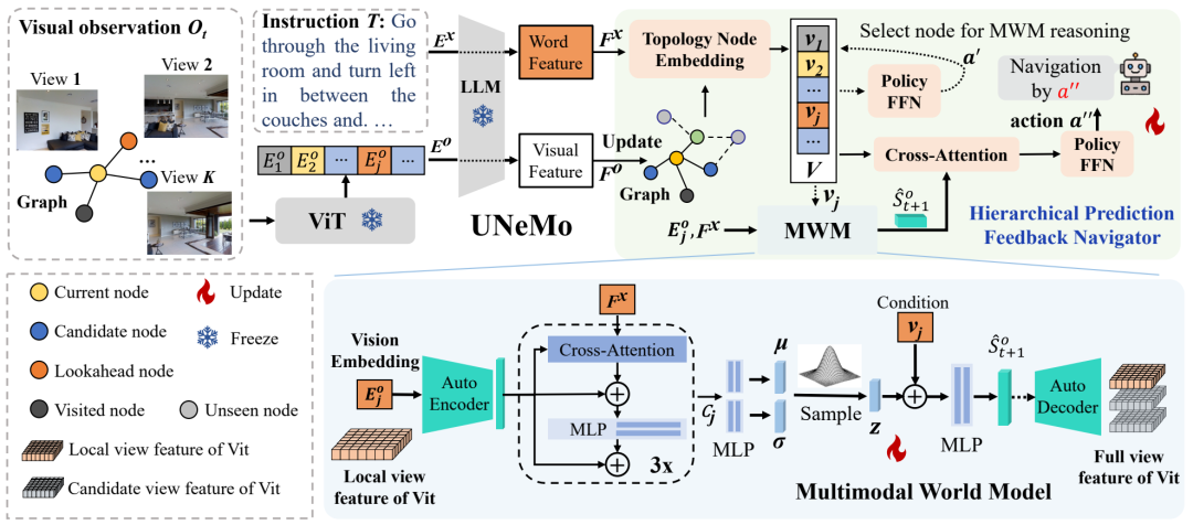 于是研究团队提出了UNeMo框架,其核心突破在于构建了“多模态世界模型(MWM)+分层预测反馈导航器(HPFN)”的双向协同架构,将视觉状态推理与导航决策深度绑定,从根本上解决现有方法的脱节问题。