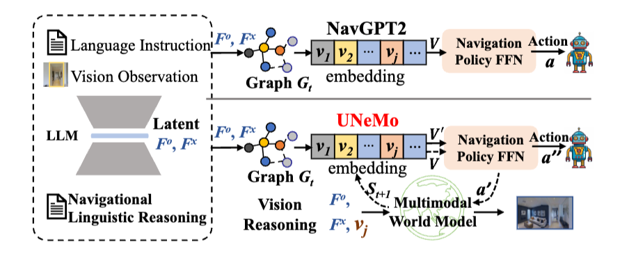 UNeMo这一通用导航架构最核心的突破在于构建了“推理-决策”相互赋能的闭环优化。