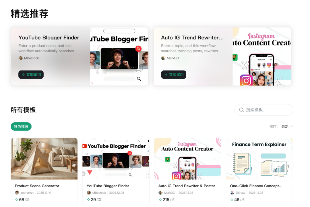 而且,这个 Workflow 还可以被发布成模板到社区。其他用户来跑,如果觉得解决了自己的问题,会去评分、点赞,这又形成了新一层反馈。