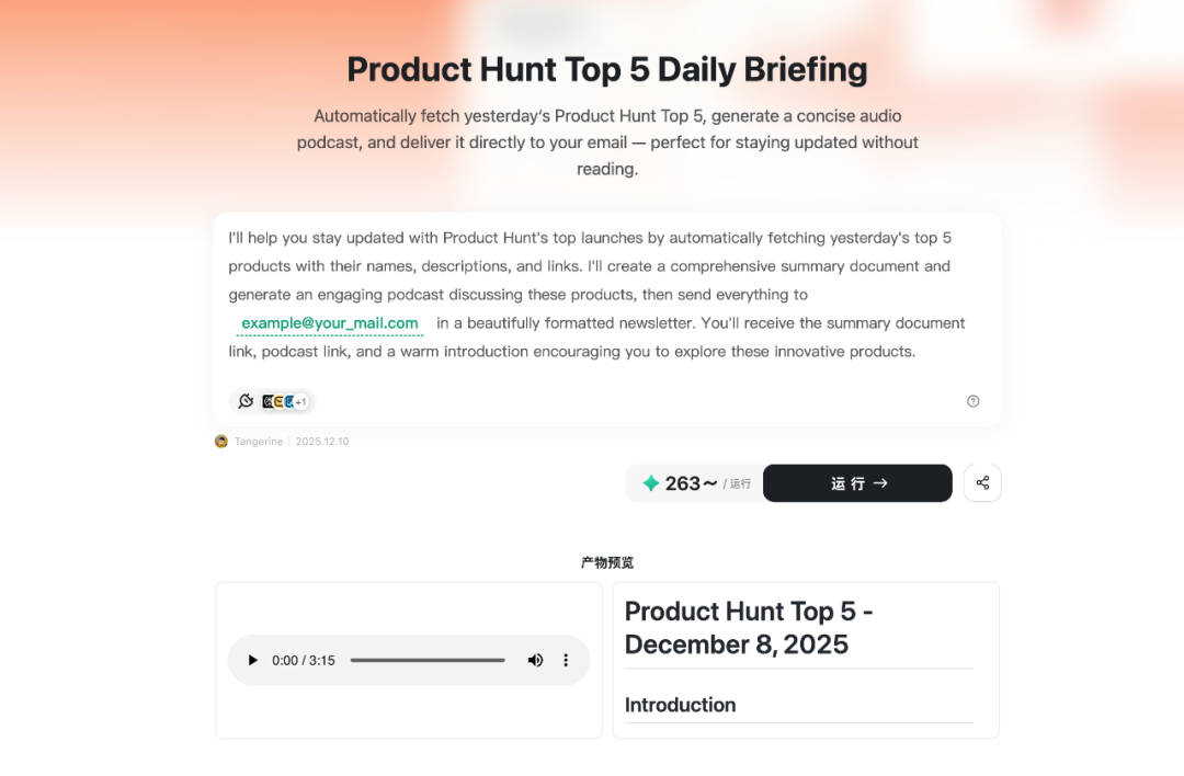 在 Refly.AI 里,从技术底层看,用户在跟 AI 交互的过程中,其实是在同步沉淀知识 + 行为。举个例子:你有一个需求,要抓 Product Hunt 上的内容发到自己邮箱。在这个过程中,你会不断表达个性化偏好:想抓周榜、日榜还是月榜?你希望抓完之后不仅生成音频,还想生成一个「双口相声」版本发给你?这些都是你的 preference。