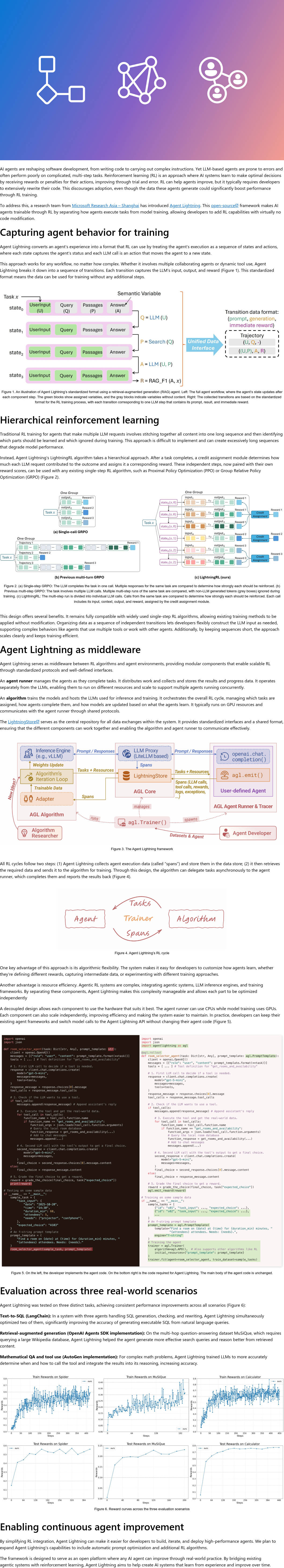 AI代理正在改变软件开发,但在复杂多步任务中易出错。强化学习(RL)虽能提升代理性能,但通常需大量重写代码,限制了其应用。为此,微软亚洲研究院—上海团队推出开源框架Agent Lightning,通过分离任务执行与模型训练,使开发者无需修改代码即可为AI代理集成RL功能。该框架可自动记录代理行为数据,构建高质量轨迹用于RL训练,显著降低技术门槛。实验表明,经RL优化的代理在数学推理、代码生成等任务中表现更优,且支持多种模型与环境。Agent Lightning推动了智能代理的自我进化能力,加速了AI代理在实际场景中的落地应用,具有广泛前景。