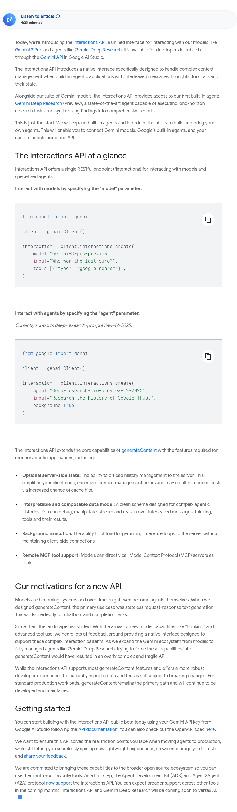 今日,谷歌推出Interactions API(公测版),通过Google AI Studio为开发者提供统一接口,用于与Gemini 3 Pro等模型及Gemini Deep Research等智能体交互。该API专为处理复杂上下文设计,支持消息、思维、工具调用及其状态的交错管理,适用于构建代理类应用。同时上线的Gemini Deep Research预览版是首款内置智能体,可执行长期研究任务并生成综合报告。未来谷歌将扩展更多内置智能体,并支持开发者构建和集成自定义智能体,实现Gemini模型、谷歌内置及第三方智能体的统一调用,打造一体化智能交互生态。