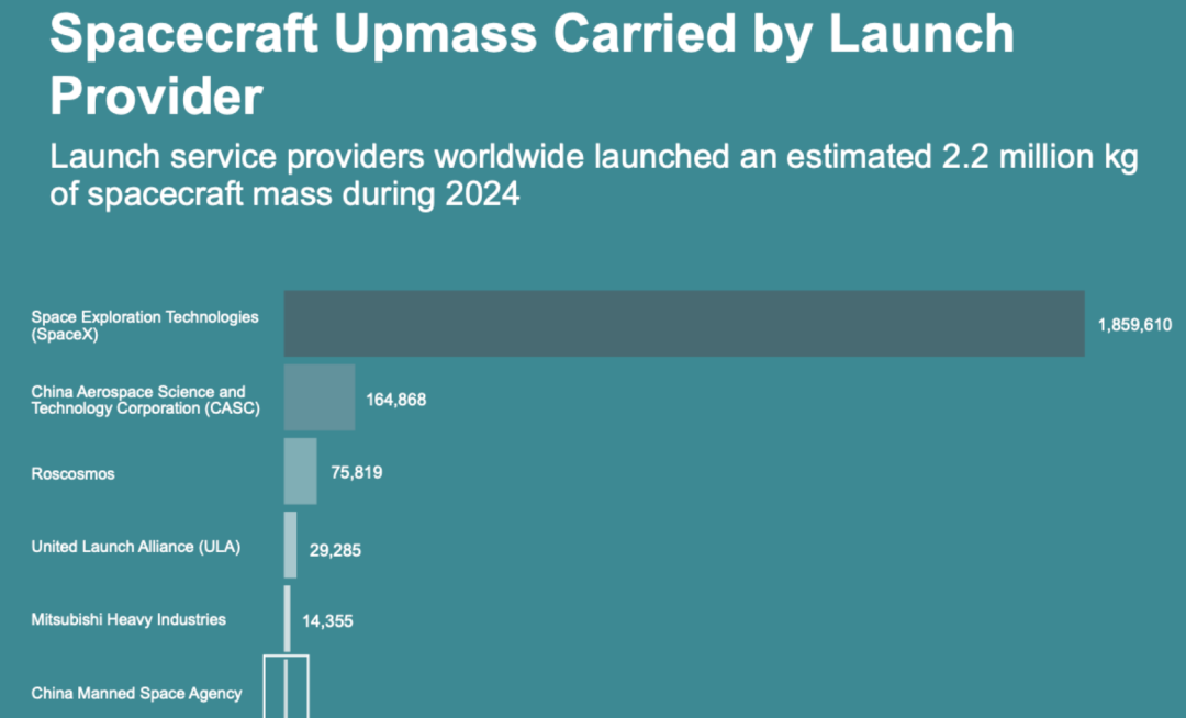 更具统治力的指标是「入轨质量」——在这个衡量航天实力的硬指标上,SpaceX一家公司就占据了全球近90%的份额。